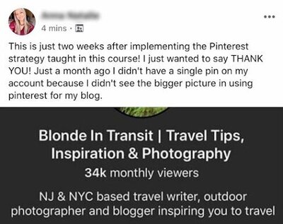 "I've tripled my blog traffic, grown my Pinterest from 5K monthly viewers to half a million, and my blog and email list continue to grow, adding new subscribers every day."